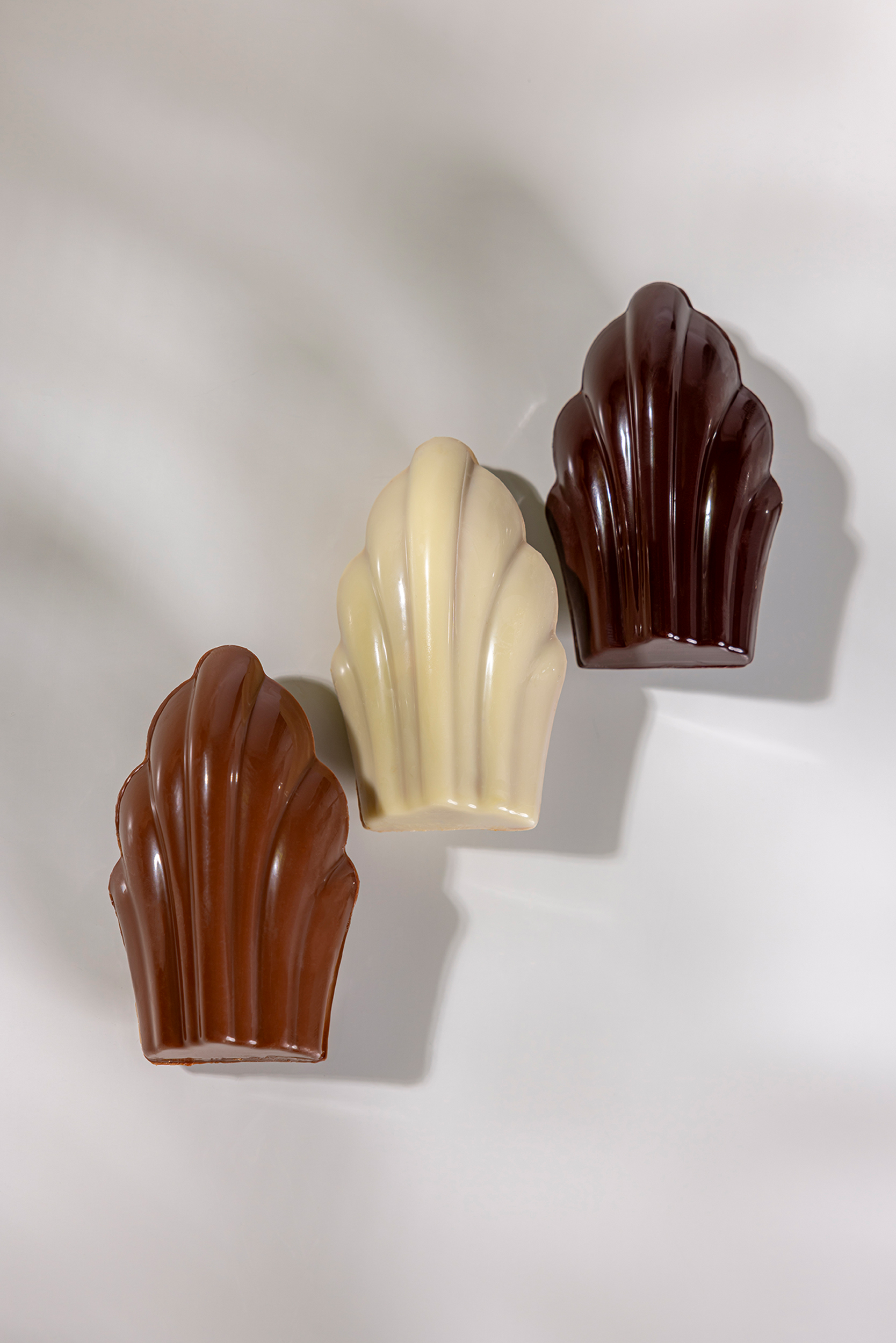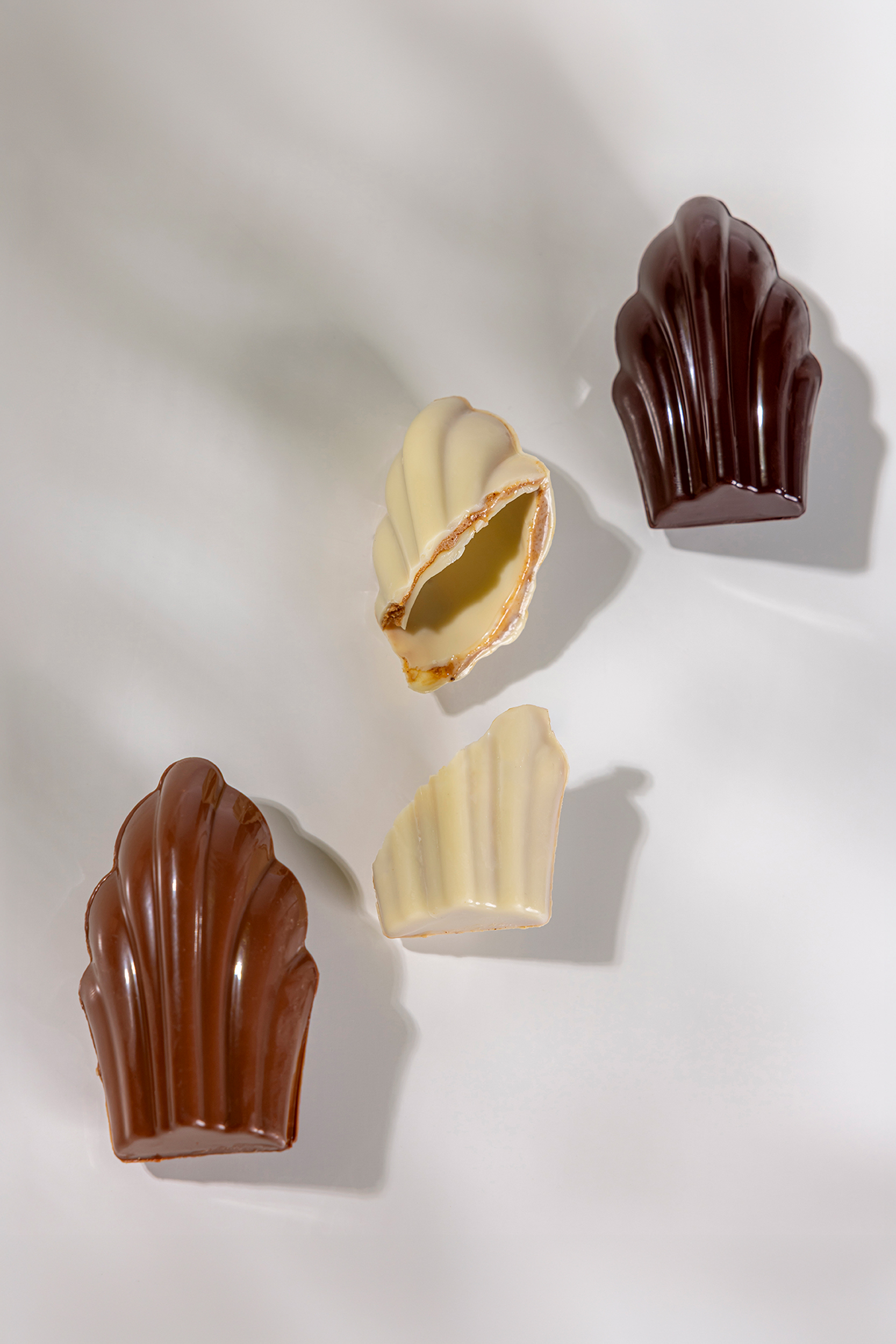 Ce coffret réunit un assortiment de madeleines moulées en chocolat, déclinées en trois variations : chocolat noir 64 % et chocolat au lait 43 % garnis d’un praliné noisette, ainsi que chocolat blanc 33 % garni d’un praliné coco, pour une palette de saveurs à la fois intense, douce et délicatement exotique.